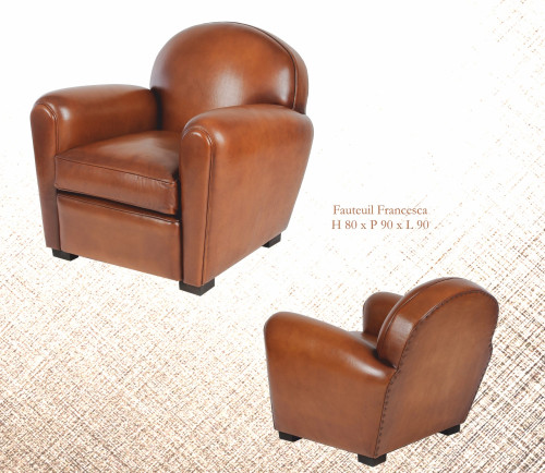 Le fauteuil Club Francesca au design parfait, qui s'associe à tout type d'intérieur. Sa structure en Pin massif offre une stabilité, et une excellente duré de vie. Revêtue de peau de basane pleine fleur, teinté, ciré et patiné à la main, nous offre un rendu lisse et agréable au toucher.