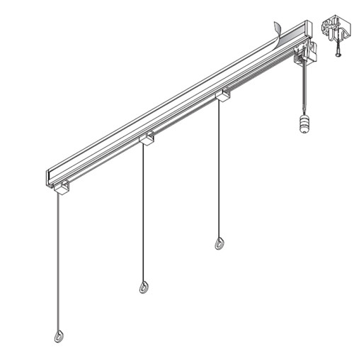 Kit store à cordons de 60cm à 3m00 de couleur blanche (10 longueurs disponibles). Comprend un rail aluminium blanc avec galon crochet + un pouliage cordon + deux guides cordons + deux embouts rail + deux supports universels R3 cm + Cordon de levage ø 1,5 mm en polypropylène, avec œillets hauteur de rideau 2M50 + 1 gland cache-nœud. (SANS JONC NI BARRE DE LESTAGE)
