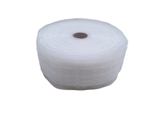 Ruban avec plis automatiques en 75mm. Pour la confection de rideaux ou de voilages. 3 coloris disponibles blanc / écru / noir / transparent.